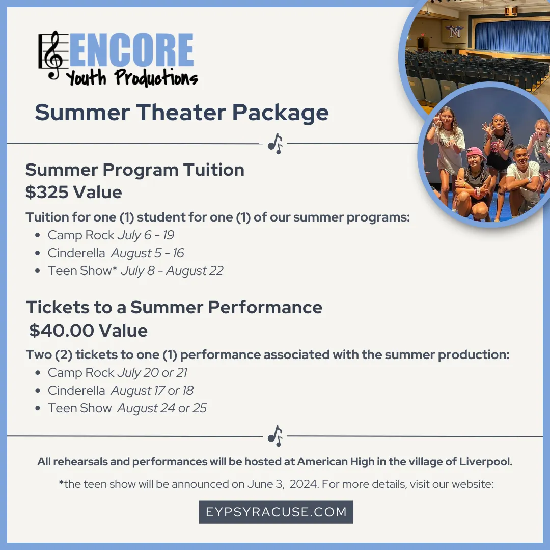 Join us for one of our summer productions at our new location, American High in the village of Liverpool! Camp Rock and Cinderella are both two week programs for students in 2nd-9th grade with auditions held on the first day and a two performance weekend to finish. Our teen show is spread throughout the summer on Monday & Thursday evenings with a two performance weekend to finish and is available for students in 7th-12th grade. Package includes tuition for one to one of our summer performances and two tickets to one of the shows.