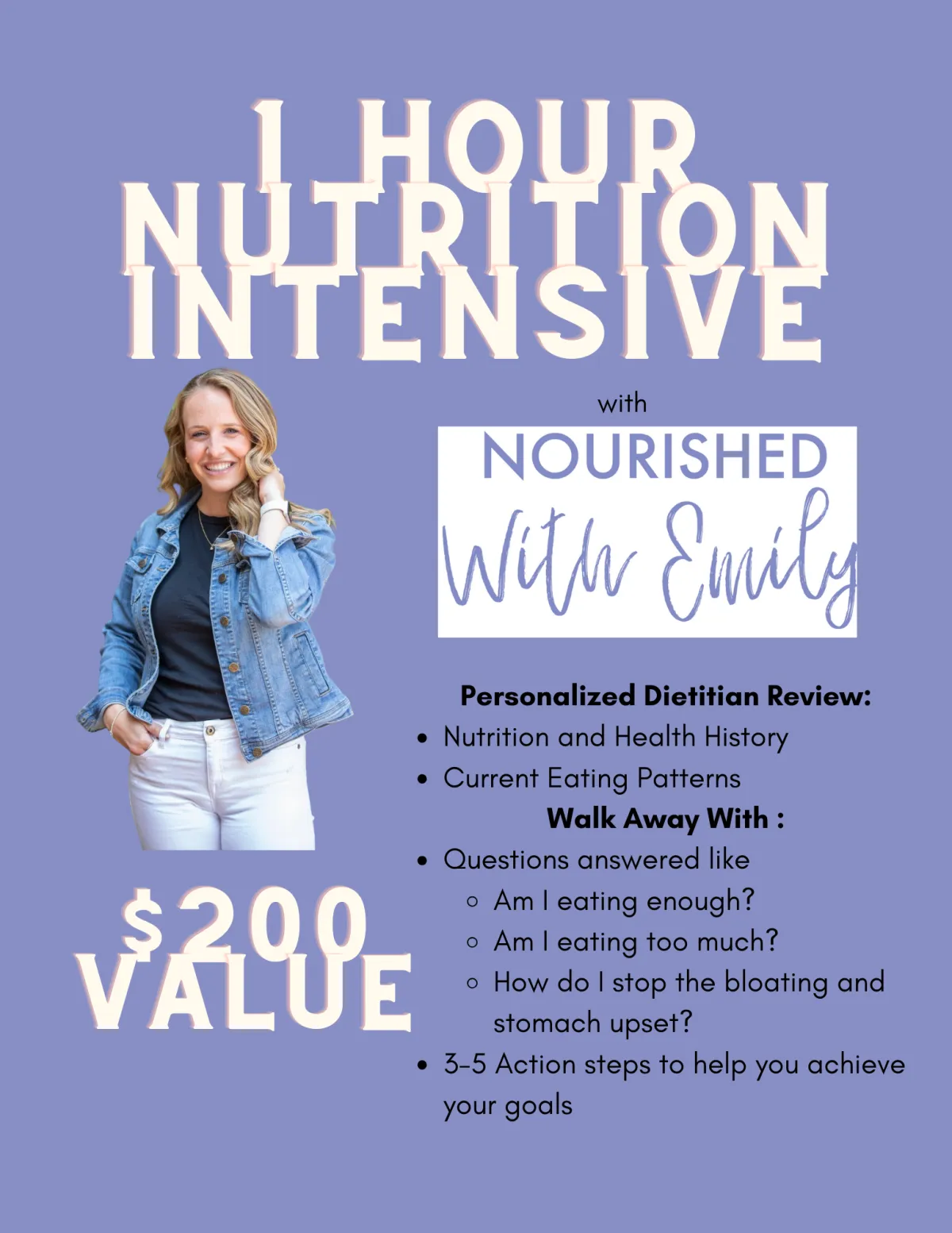 Did you have labs done recently and you aren't sure what the results mean or how to correct them? Want to build a healthier lifestyle but not want to give up your favorite foods? Feel like your energy is in the tank? This one-hour consultation with Emily Tills, MS RDN CDN of Nourished with Emily will help to get your questions answered and build a path to help you make change and see lasting success. You'll walk away with 3-5 action steps to help you on your journey as well as get your questions answered by a Registered Dietitian. These 1-hour consultations are valued at $200!