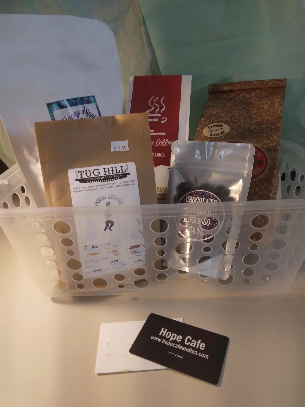Coffee Tug Hill, Finger Lakes, Paul diLima, $15 Gift card to Hope Cafe, $15 Gift Card to Bagelicious, Chocolate Covered Espresso Beans, Happy Hippy coffee