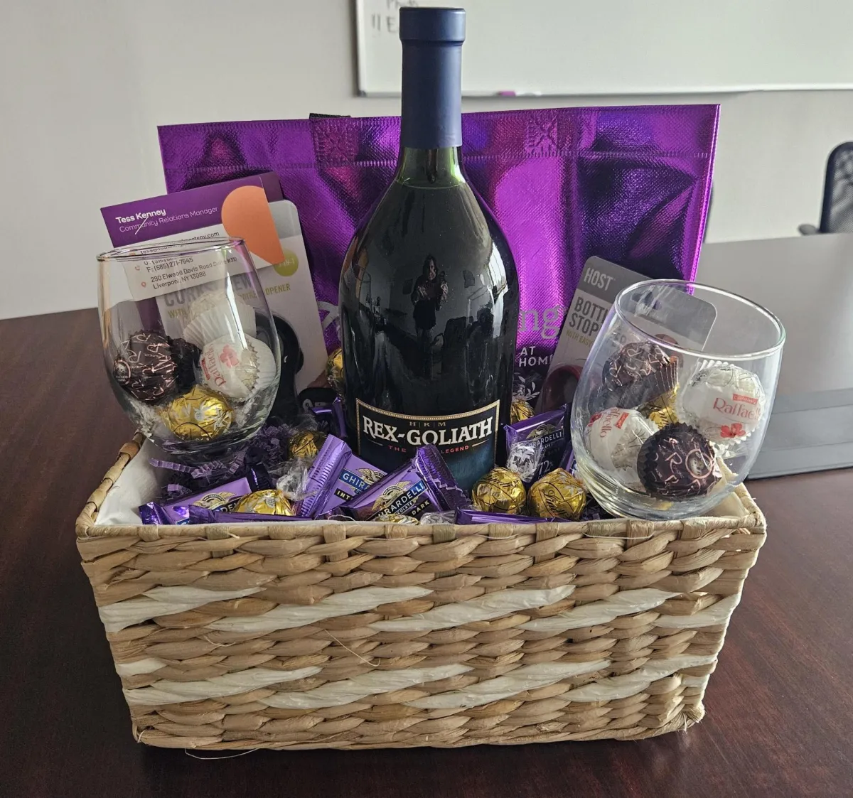 This basket contains a large bottle of Rex-Goliath Merlot, 2 wine glasses, Waiter's Corkscrew, 2 Bottle Stoppers, Chocolate (Ferrero Collection, Lindt Lindor, and Ghirardelli).