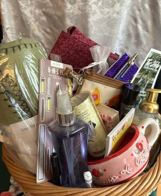 It contains a polar, lunch, tote, fleece blanket, coffee, mug, shimmering, champagne, soap, candle, earbuds, travel, jewelry, bag, wristlet, handmade, mini wine, purse, earrings, and so much more, it is valued at over $275!!!
